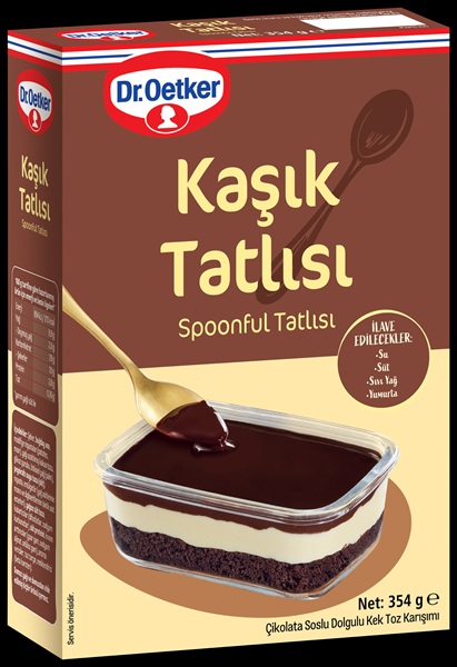 Dr. Oetker Kaşık Tatlısı, çikolata sosu, krema dolgusu ve çikolatalı keki ile her kaşıkta zengin bir tatlı keyfi sunuyor. Ürün; su, süt, sıvı yağ ve yumurta eklenerek kısa sürede hazırlanabiliyor.