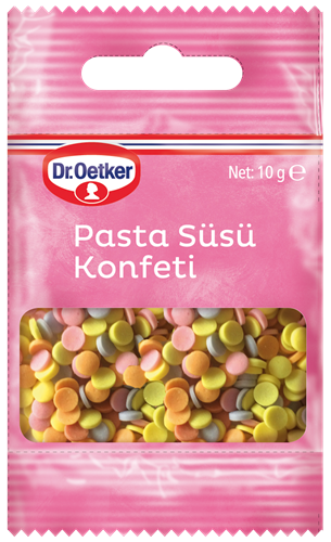 Kullanıma hazır olan ve farklı renklerde konfetiler içeren bu ürün ile tariflere neşeli görünümler vermek mümkün.